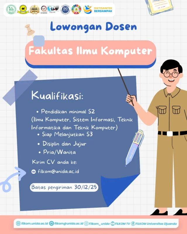 Persyaratan: Pendidikan: Minimal SMA/SMK/Sederajat Usia: Maksimal 0 Tahun Jenis Kelamin: Semua jenis kelamin Pengalaman: Minimal 0 Tahun Pekerjaan ini membutuhkan kemampuan: Deskripsi Pekerjaan: – Min. Lulusan S2 Ilmu Komputer/ sistem informasi/informatika – ⁠Pria/wanita – ⁠Berpengalaman dibidangnya – ⁠Komunikatif – ⁠Jujur dan bertanggung Jawab – Dapat bekerjasama dalam tim maupun individu – ⁠Bekerja dibawah tekanan Hari Kerja: Senin … Baca Selengkapnya