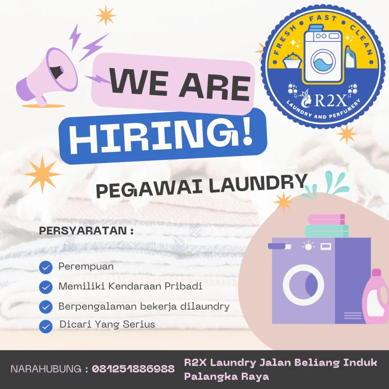 Persyaratan: Pendidikan: Minimal SMA/SMK/Sederajat Usia: Maksimal 0 Tahun Jenis Kelamin: Perempuan Pengalaman: Minimal 0 Tahun Pekerjaan ini membutuhkan kemampuan: Deskripsi Pekerjaan: – Perempuan – Usia 18–35 Tahun – Domisili Belitung – Pendidikan min SMA/SMK – Bertanggungjawab dan jujur – Mampu bekerja sama dalam tim – Komunikatif & sigap – Bisa menyetrika dengan rapi Hari Kerja: … Baca Selengkapnya