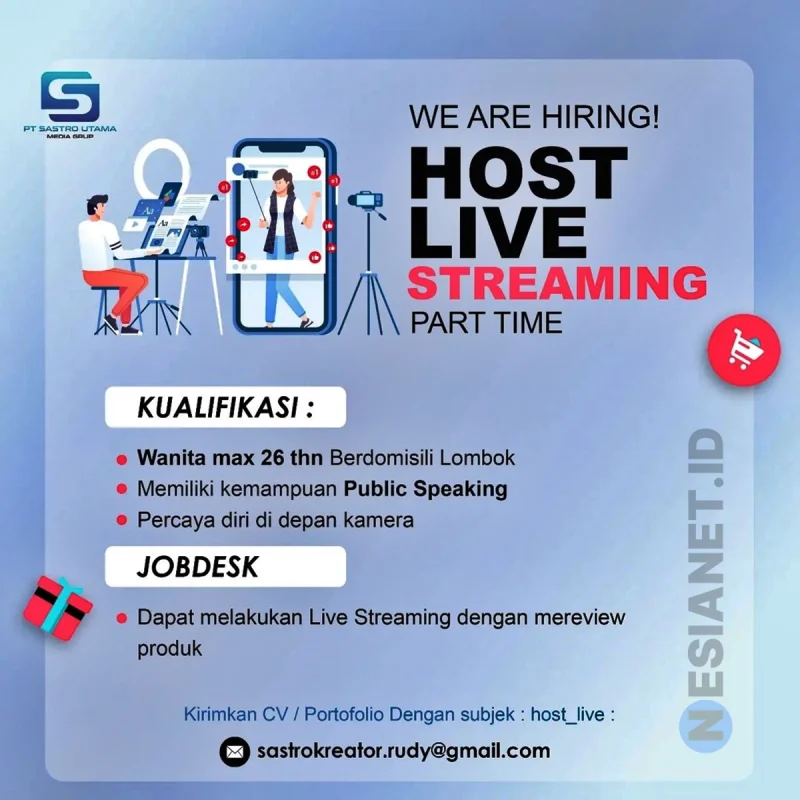 Persyaratan: Pendidikan: Minimal SMA/SMK/Sederajat Usia: Maksimal 0 Tahun Jenis Kelamin: Semua jenis kelamin Pengalaman: Minimal 0 Tahun Pekerjaan ini membutuhkan kemampuan: Deskripsi Pekerjaan: – Membuat konten – Melakukan live streaming di Shopee dan Tiktok – Mampu menjelaskan detail produk dan meningkatkan penjualan Hari Kerja: Senin – Sabtu Jam Kerja: 08:00 – 17:00