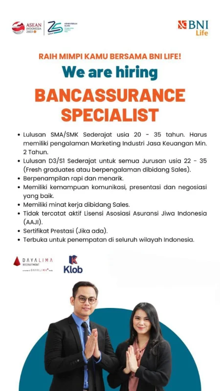 Persyaratan: Pendidikan: Minimal D3/D4 Usia: Maksimal 35 Tahun Jenis Kelamin: gender. Pengalaman: Minimal 1 Tahun Pekerjaan ini membutuhkan kemampuan: Deskripsi Pekerjaan: BANCASSURANCE SPECIALIST (BAS) Representative BNI Life yang akan ditempatkan di cabang Bank BNI bertugas melakukan pemasaran produk Bancassurance (Individu). Penemapatan BNI KCP Mamasa Kualifikasi : Untuk SMA/Sederajat usia 20 – 35 tahun. Harus berpengalaman … Baca Selengkapnya