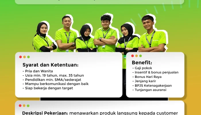 Persyaratan: Pendidikan: Minimal SMA/SMK/Sederajat Usia: Maksimal 30 Tahun Jenis Kelamin: gender. Pengalaman: Minimal 0 Tahun Pekerjaan ini membutuhkan kemampuan: Deskripsi Pekerjaan: PROMOTOR SALES INDODANA – GAJI + KOMISI BESAR Penghasilan hingga 3–20 Juta / bulan Penempatan: Mall / Store Elektronik Fresh Graduate Dipersilakan Melamar Tugas Pekerjaan • Menawarkan dan mempromosikan layanan Indodana PayLater kepada customer … Baca Selengkapnya