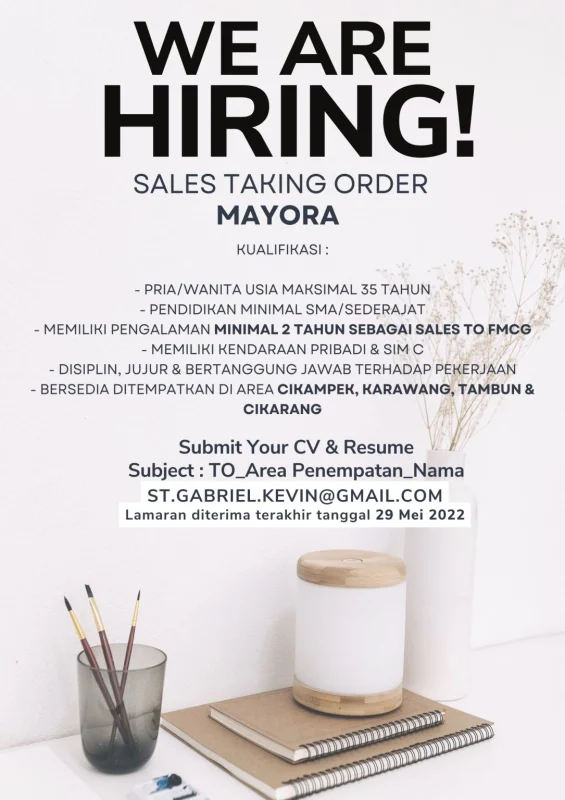 Persyaratan: Pendidikan: Minimal SMA/SMK/Sederajat Usia: Maksimal 30 Tahun Jenis Kelamin: gender. Pengalaman: Minimal 1 Tahun Pekerjaan ini membutuhkan kemampuan: Deskripsi Pekerjaan: Kualifikasi : Pendidikan minimal SMA/SMK sederajat Memiliki motor pribadi dan SIM C Berpengalaman minimal 1 tahun sebagai sales dibidang FMCG Komunikatif dan menyukai pekerjaan lapangan WILAYAH PENEMPATAN: Karawang Hari Kerja: Senin – Sabtu Jam … Baca Selengkapnya