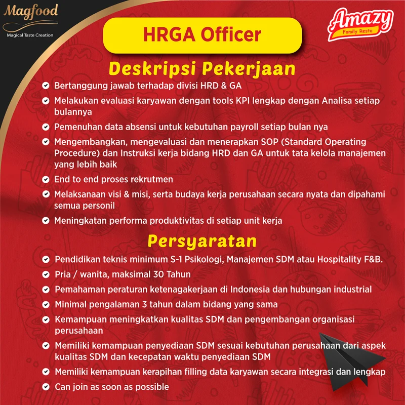 Persyaratan: Pendidikan: Minimal SMA/SMK/Sederajat Usia: Maksimal Tidak ada batas usia Tahun Jenis Kelamin: Laki-laki Pengalaman: Minimal 0 Tahun Pekerjaan ini membutuhkan kemampuan: Deskripsi Pekerjaan: Deskripsi Pekerjaan : 1. Melakukan perekrutan tenaga kerja (operator) sesuai kebutuhan operasional gudang 2. Memastikan kelengkapan data dan validitas dokumen calon operator 3. Mengatur jadwal kerja, briefing harian, serta pembagian tugas … Baca Selengkapnya