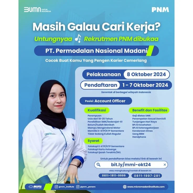 Persyaratan: Pendidikan: Minimal SMA/SMK/Sederajat Usia: Maksimal 32 Tahun Jenis Kelamin: Perempuan Pengalaman: Minimal 0 Tahun Pekerjaan ini membutuhkan kemampuan: Deskripsi Pekerjaan: Perkenalkan saya HR Rekrutmen Jateng & DIY, PT. Bina Artha Ventura merupakan lembaga pembiayaan, Jangan lupa mengisi link : bit.ly/pelamar-bav AO merupakan pekerjaan berbasis pelayanan yang akan bekerja di lapangan. Adapun tugas dan tanggung … Baca Selengkapnya